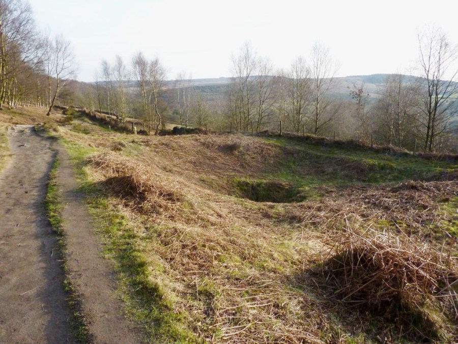 A bell pit by the path from Robin Hood to Nelson’s Monument. The miners dug a hole then extracted the coal undermining the edges as they did so.