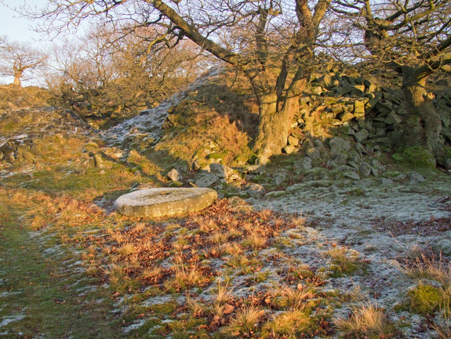 The winter sunset lights up this flat millstone lying in front of a old oak tree and a spoil heap.